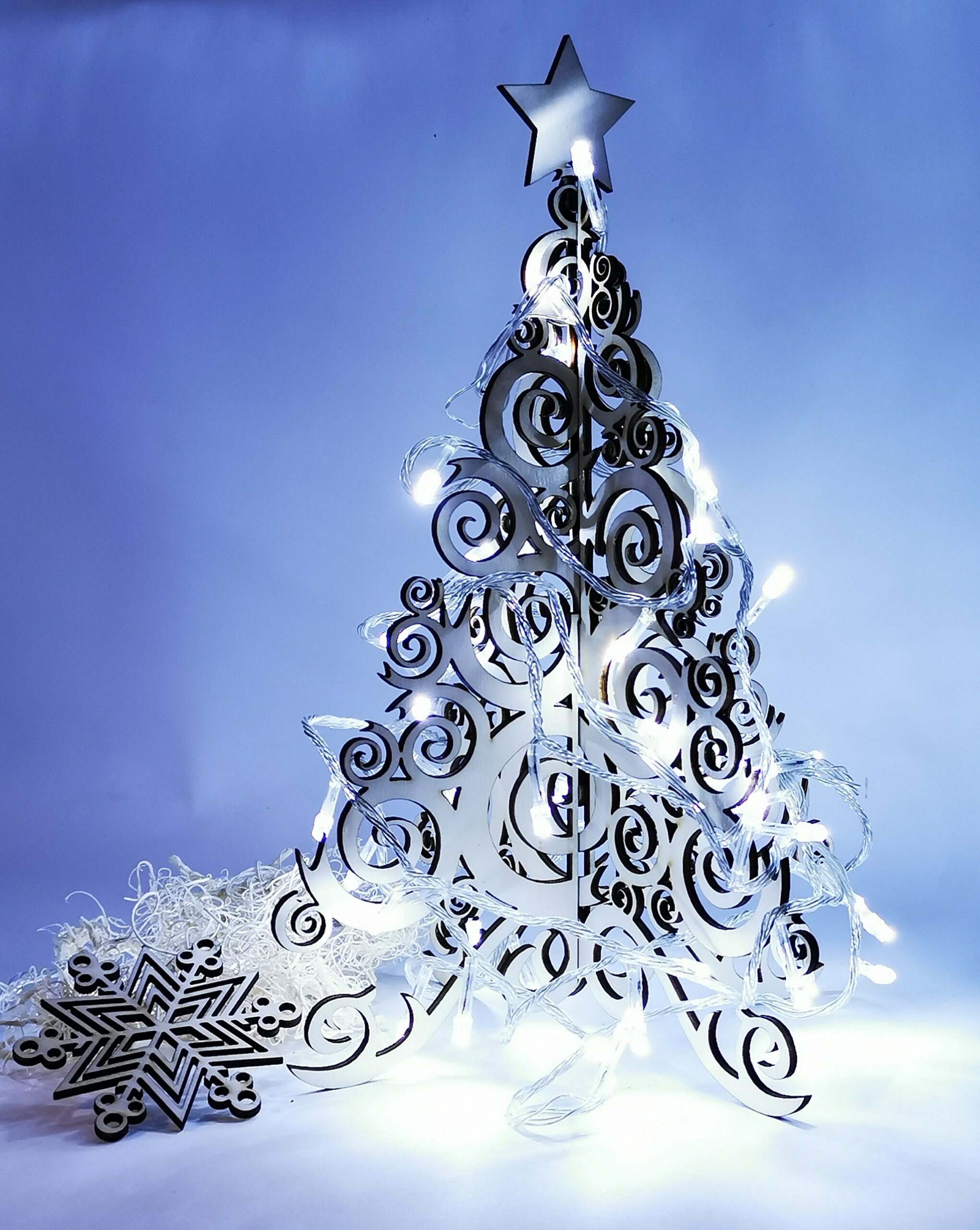 Izdelano iz 6 mm vezane plošče, primerno kot samostojna dekoracija, ki lahko nadomesti klasično božično drevo.